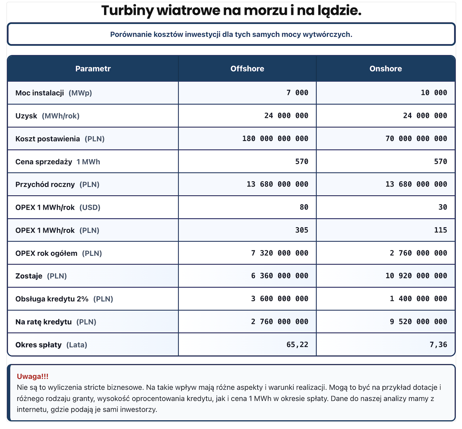 A teraz w podobny sposób obliczymy onshore. Zrobimy to dla takiej mocy, która wygeneruje taką samą ilość energii rocznie. I tak: 1 MWp generuje ok. 2.400 MWh/rok. Do wygenerowania 24 mln MWh potrzeba turbin wiatrowych o łącznej mocy 10 GW. Koszt jednego MWp to, przy tej ilości, maks. 7 mln PLN. To znaczy, że koszt całkowity to 70 mld PLN.